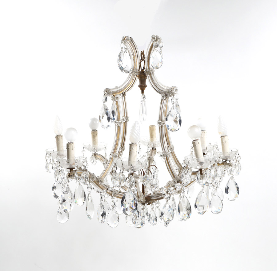 LAMPADARIO A OTTO LUCI metà XX Sec. struttura in metallo rivestita in vetro molato e gocce pendenti 70x70 cm.