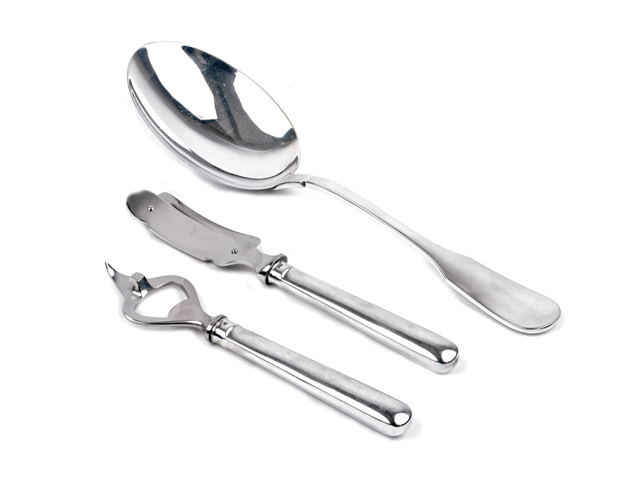 Lot 393 | SET DI TRE POSATE DA PORTATA IN ARGENTO E ACCIAIO Italia, XX Sec. peso 200 gr.