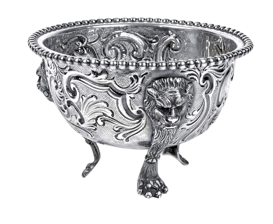 CESTINO IN ARGENTO SBALZATO Italia, XX Sec. di forma circolare poggiante su tre piedini ferini, cm. 9x13,5 peso 262 gr.