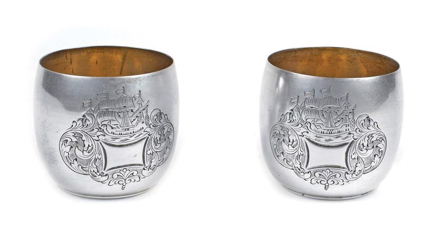COPPIA DI BICCHIERI BASSI IN ARGENTO Italia, metà XX Sec. corpo liscio centrato da cartiglio, interno in argento vermeil, h. cm. 7,5 peso 247 gr.