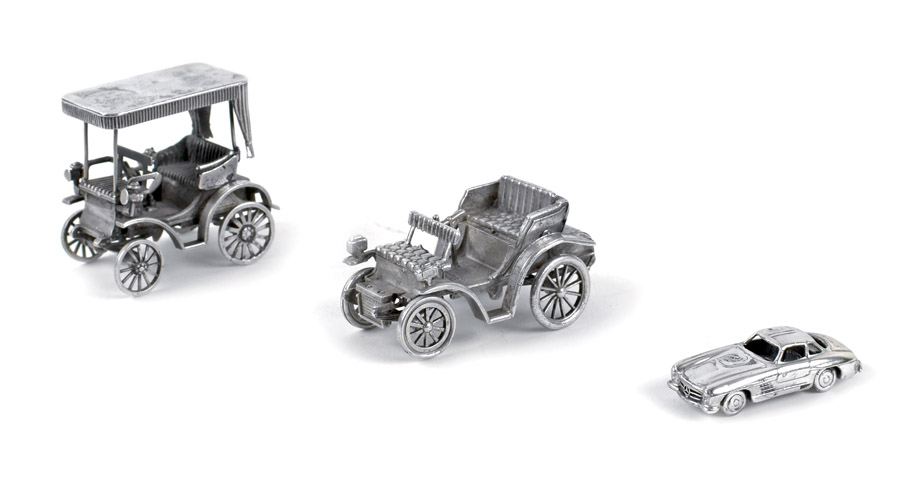 TRE MODELLINI DI AUTOMOBILI IN ARGENTO XX Sec. fogge e misure diverse peso 188 gr.