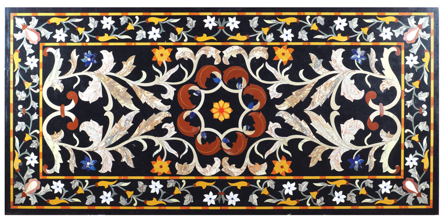 GRANDE PIANO RETTANGOLARE IN MARMO XX Sec. intarsiato in marmi policromi, lapislazzulo, rosso antico e giallo di Siena, decorato a motivi floreali e di volute 99x209 cm.