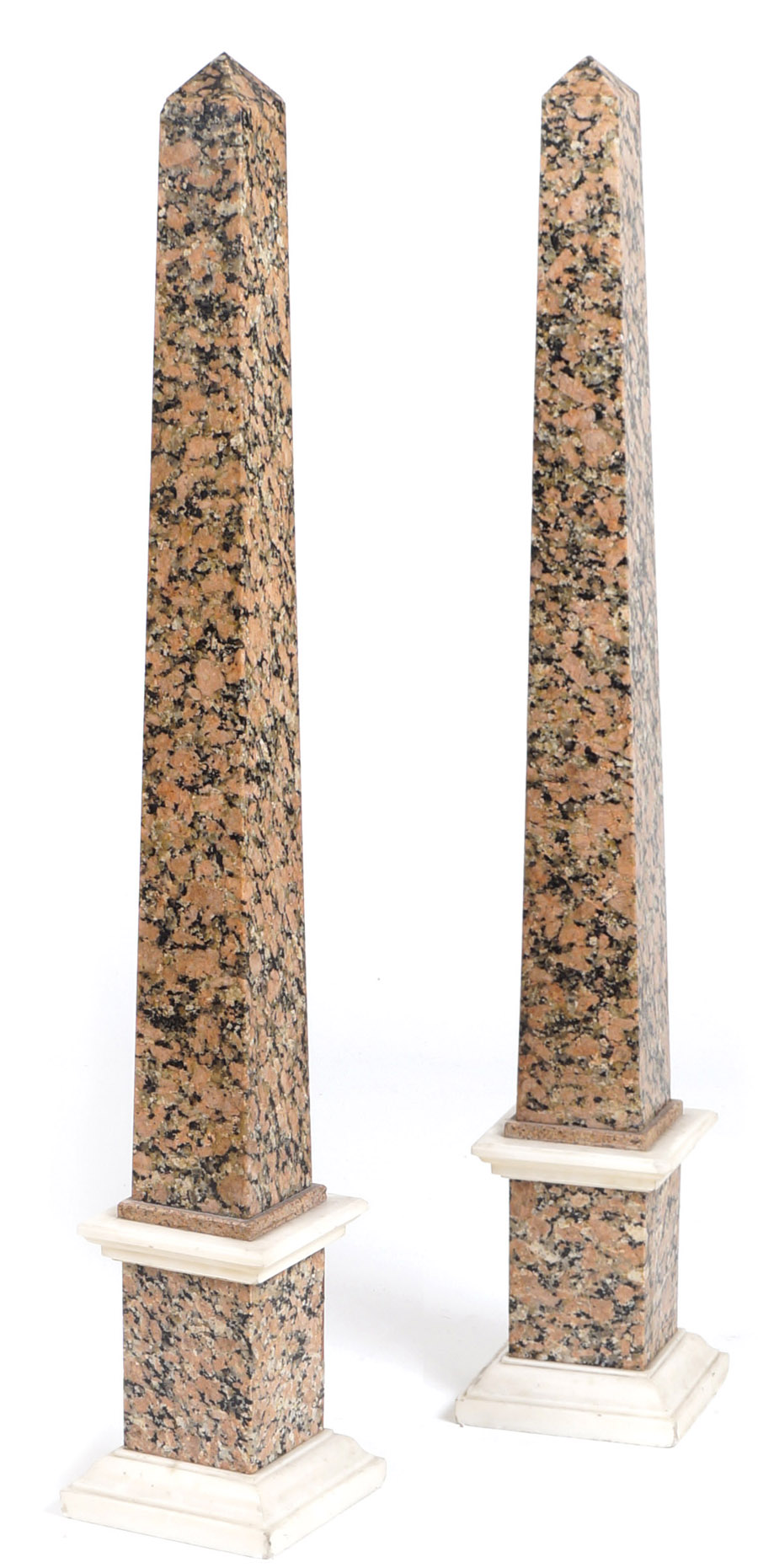 COPPIA DI OBELISCHI IN GRANITO ROSA Italia, fine XIX Sec. e bianco di Carrara...