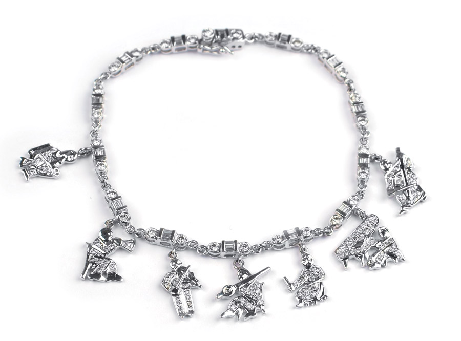 BRACCIALE CHARMS IN PLATINO E DIAMANTI taglio brillante e baguettes per ct 2.50 circa con sette pendenti di fogge diverse, lunghezza cm. 18 peso 12,8 gr.
