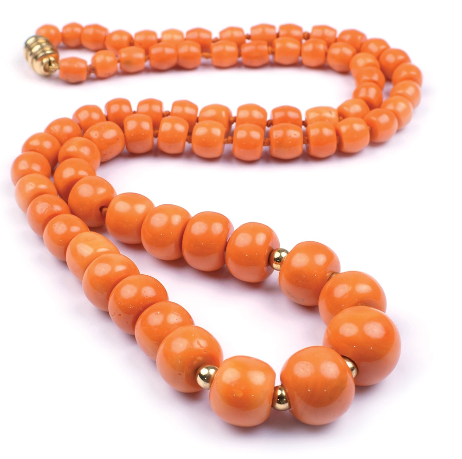 LUNGO FILO DI CORALLO CERASUOLO disposto a gradazione da mm. 8 a mm. 19, sfere e chiusura a barilotto in oro giallo 18kt, lunghezza cm. 80 peso 171,4 gr.