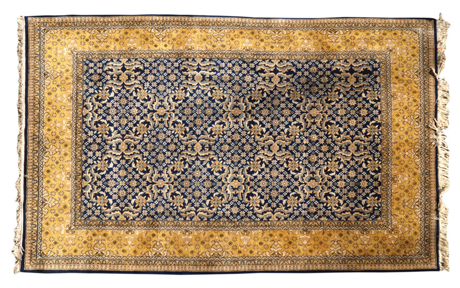 TAPPETO KUM Persia, XX Sec. con motivo a grata floreale su fondo blu 250x168 cm.