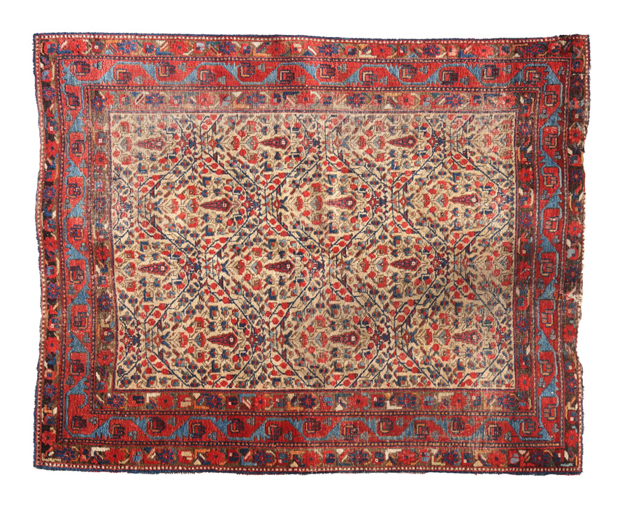 TAPPETO VERAMIN Persia, vecchia manifattura con decorazione a motivi floreali stilizzati su fondo avorio, usure e difetti 175x144 cm.