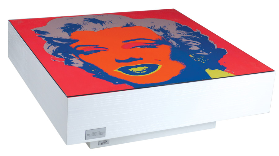 ANDY WARHOL Pittsburgh 1928 - New York 1987 tavolino "Marilyn" con serigrafia a colori, edizione Sunday B. Morning, base in legno bianco. Su un lato etichetta con i dati dell'opera e tiratura es.38/150. 33x92x92 cm.