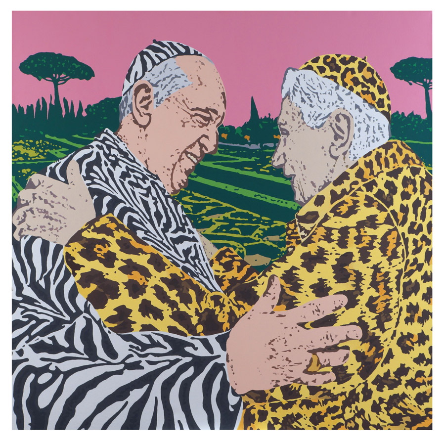 JULIAN PETROZA XX Sec. "Safari sacro", acrilico su tela, anno 2013, firmato e datato sul retro 100x100 cm.
