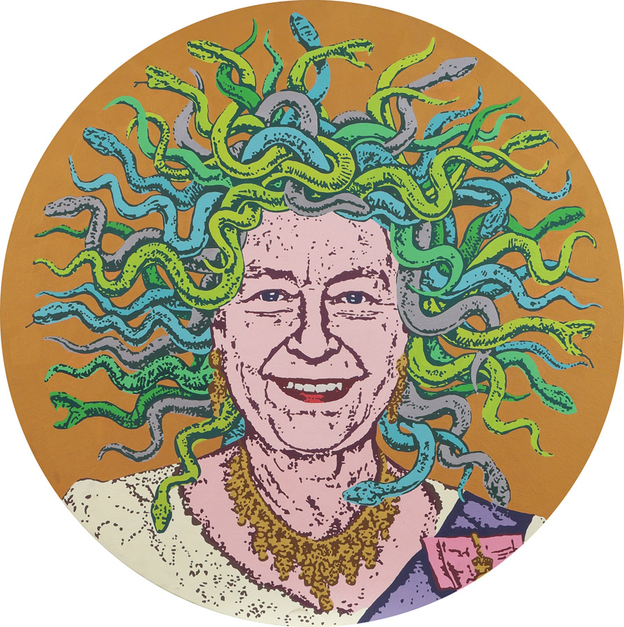 JULIAN PETROZA XX Sec. "Cascabel segunda the heaviest head in the west", acrilico su tela, anno 2014, firmato sul retro d. 60 cm.
