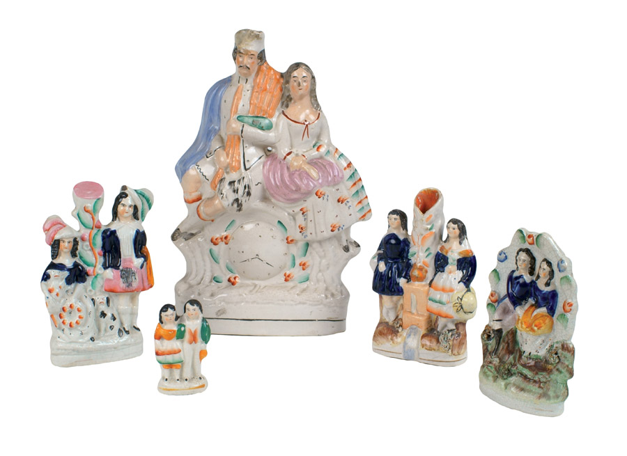 CINQUE SCULTURE IN CERAMICA STAFFORDSHIRE Inghilterra, fine XIX inizio XX Sec. fogge e misure diverse, difetti e restauri