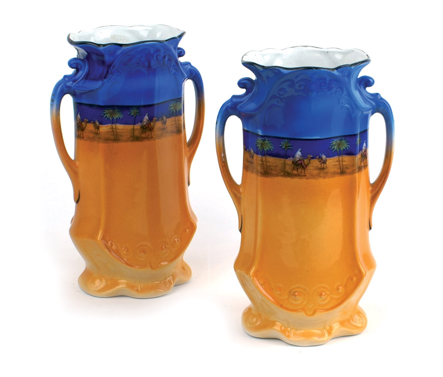 COPPIA DI VASI IN CERAMICA inizio XX Sec. a due manici, dipinti in policromia e decorati a motivo orientalista h. 22 cm.