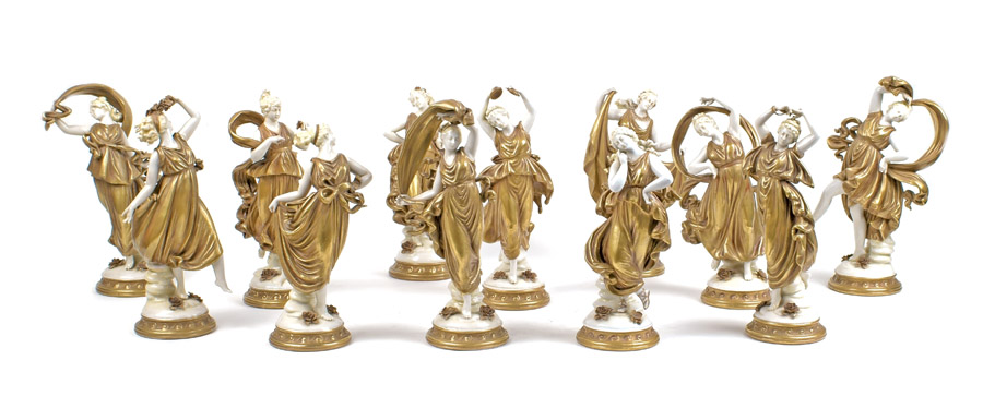 DODICI FIGURE IN PORCELLANA BIANCA E ORO Capodimonte, XX Sec. raffiguranti danzatrici poggianti su basi circolari h. 25 cm. circa