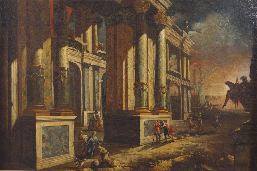 SCUOLA ITALIANA XVIII Sec. "Capriccio architettonico con personaggi", olio su...