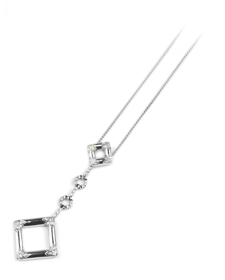 COLLANA IN ORO BIANCO 18KT firmata Recarlo con pendente a motivo geometrico in oro e diamanti taglio brillante per 0,49 punti circa, lunghezza regolabile, max l. cm. 30, accompagnato da certificato di garanzia peso 15 gr.