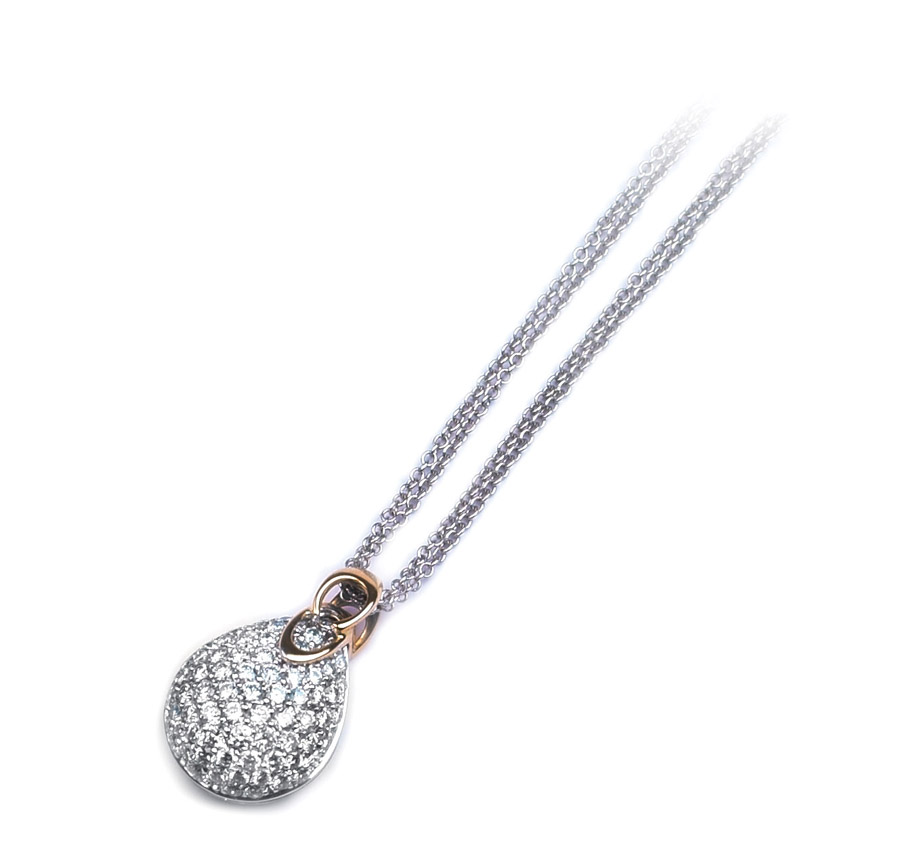 COLLANA IN ORO BIANCO E ROSSO 18KT firmata Chimento pendente a goccia con pavè di diamanti taglio brillante per ct 1.20 circa, lunghezza regolabile, max l. cm. 24 peso 7 gr.
