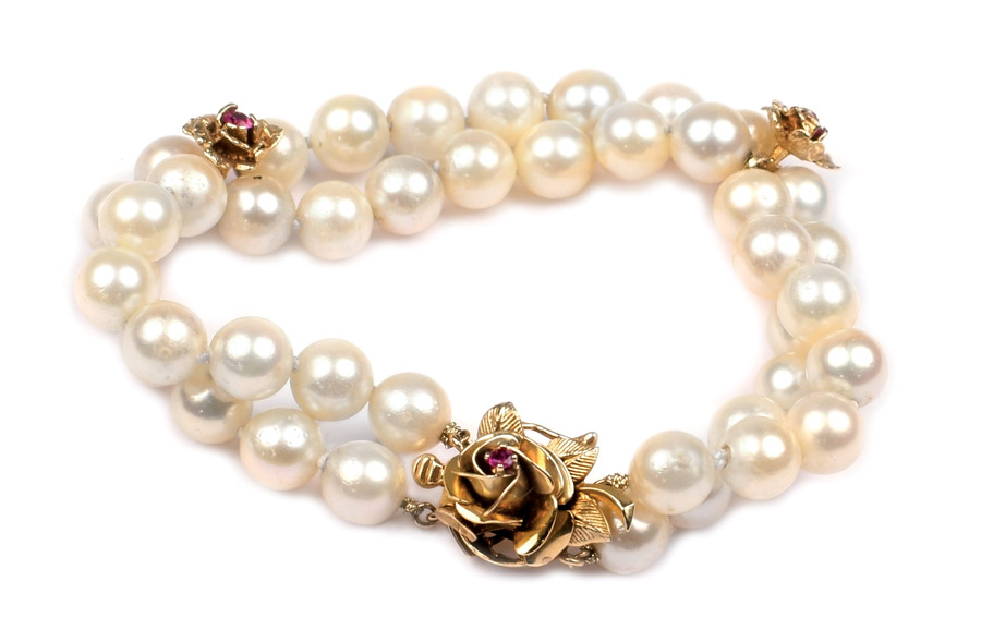 BRACCIALE A DUE FILI DI PERLE COLTIVATE DI MM. 7,5 anni 50/60 con due elementi e chiusura a motivo di rosa in oro giallo 18kt centrate da rubini tondi, lunghezza cm. 19 peso 35 gr.