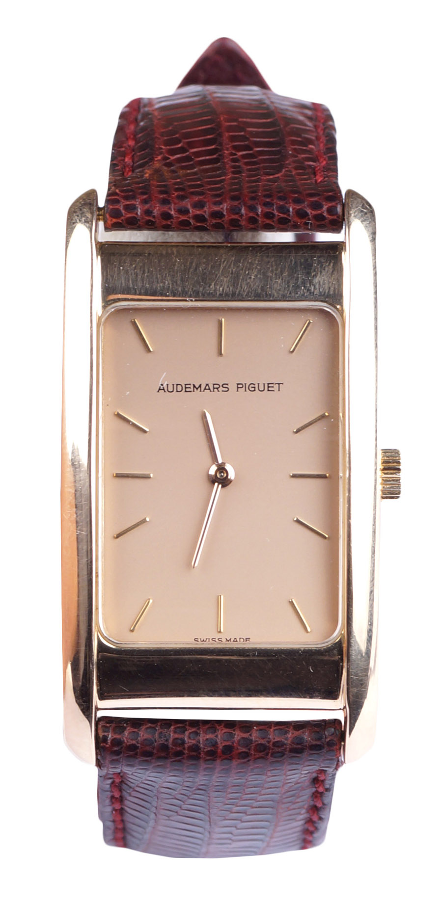 OROLOGIO DA POLSO AUDEMARS PIGUET IN ORO ROSA 18KT anni 80 cassa rettangolare, quadrante salmone con indici dorati, vetro zaffiro, movimento meccanico a carica manuale, cinturino originale con fibbia in oro rosa, ref. C-77331