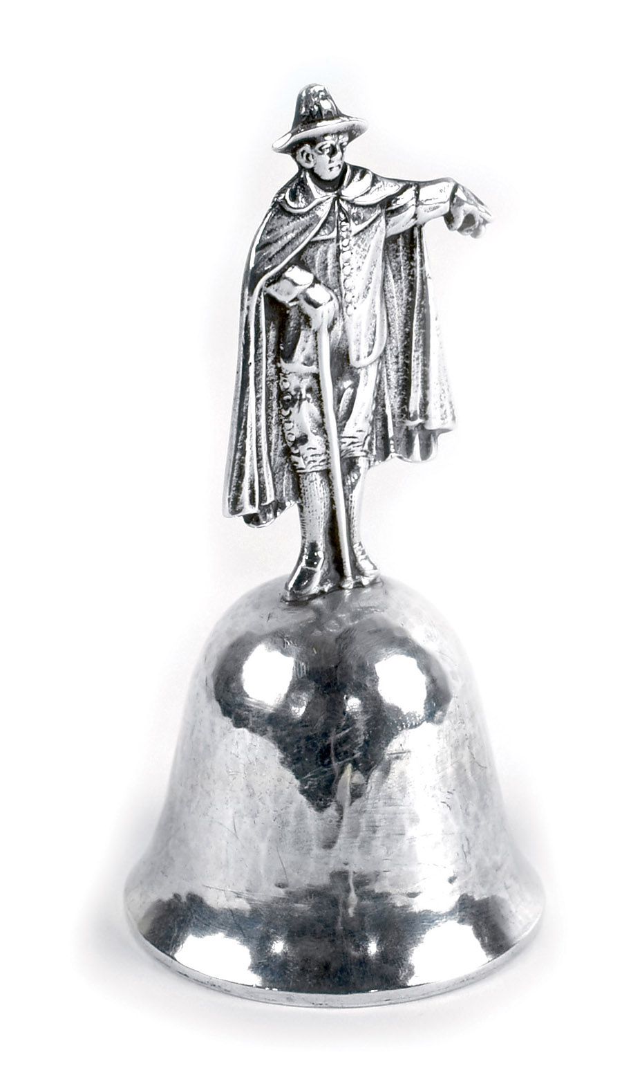 CAMPANELLO IN ARGENTO Usa, inizio XX Sec. presa a raffigurare una figura maschile, h. cm. 11 peso 100 gr.