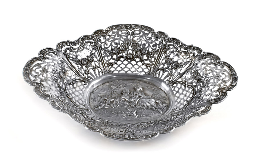 CESTINO IN ARGENTO Germania, XIX Sec. traforato ed inciso a motivi floreali e di volute, al centro sbalzato a raffigurare una scena galante, orafo J.D.Schleibner  cm. 5,5x30x24 peso 317 gr.