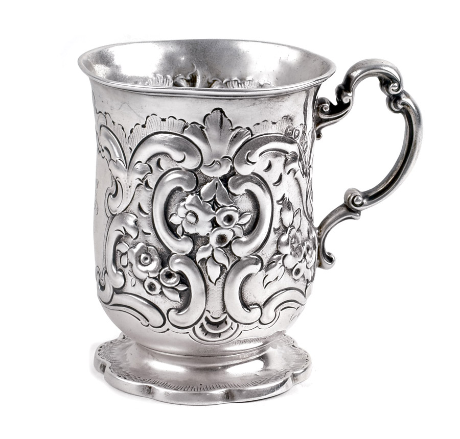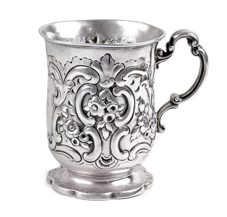 BOCCALINO IN ARGENTO Londra, Regina Vittoria, 1854 sbalzato a motivi floreali e centrato da cartiglio, manico a voluta, h. cm. 9 peso 130 gr.