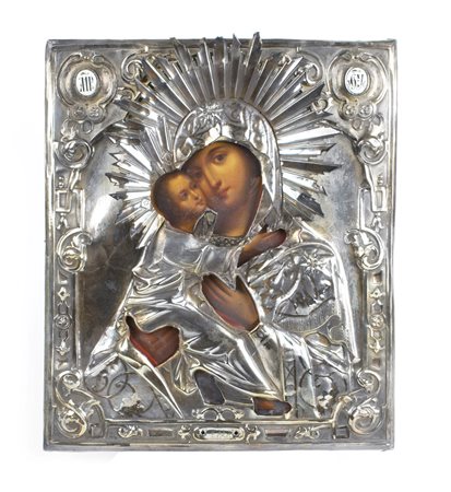 ICONA CON RIZA IN ARGENTO DORATO ED APPLICAZIONI IN SMALTO Mosca, 1858 raffigurante la Vergine con Bambino Gesù, tempera su tavola 31x26 cm.