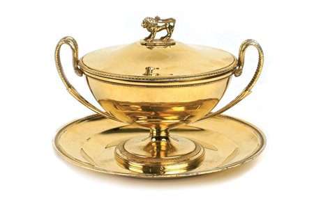 PRÈSENTOIR IN ARGENTO VERMEIL Francia, 1798 - 1809 coppa e piattino finemente incisi a motivi di palmette, manici a foggia di serpenti, presa a motivo di leone, orafo argentiere Amèdèe Francois Chevassu, cm. 12x17 peso 554 gr.