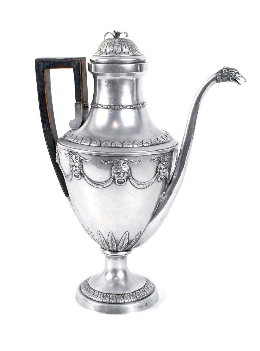 GRANDE CAFFETTIERA IN ARGENTO Roma, 1790 - 1809, (bollo n.145) maestro orafo argentiere Carlo Bartolotti ( Roma 1777-1824) (bollo n.230), corpo piriforme con fascia decorata a motivo di tralcio di mascheroni poggiante su base circolare con bordura fogliacia, becco con terminale a testa di aquila, manico in legno ebanizzato, h. cm. 37 Bibliografia : Costantino Bulgari, Argentieri Gemmari e Orafi d'Italia, Lorenzo Del Turco, Roma peso lordo 1115 gr.
