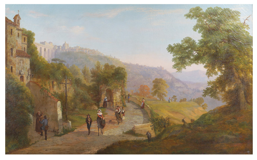 JOSEPH C. ROPES Stati Uniti, 1812 -1885 "Veduta di Ariccia con personaggi"olio su tela, firmato e datato 1860 in basso a destra, entro cornice non coeva Joseph Ropes nasce a Salem in Massachusetts nel 1812, diventa un artista verso la metà degli anni trenta quando finisce gli studi presso l'Accademia di Design. Dopo ulteriori anni di studio a New York, si stabilisce a Hartford, dove apre il suo studio nel 1851. Joseph e' stato anche un eccellente miniaturista,e paesaggista con una speciale predilezione per il paesaggio della campagna di romana (molte le vedute degli acquedotti e dei laghi dei castelli romani). Muore nel 1885 a New York City 86x138 cm.