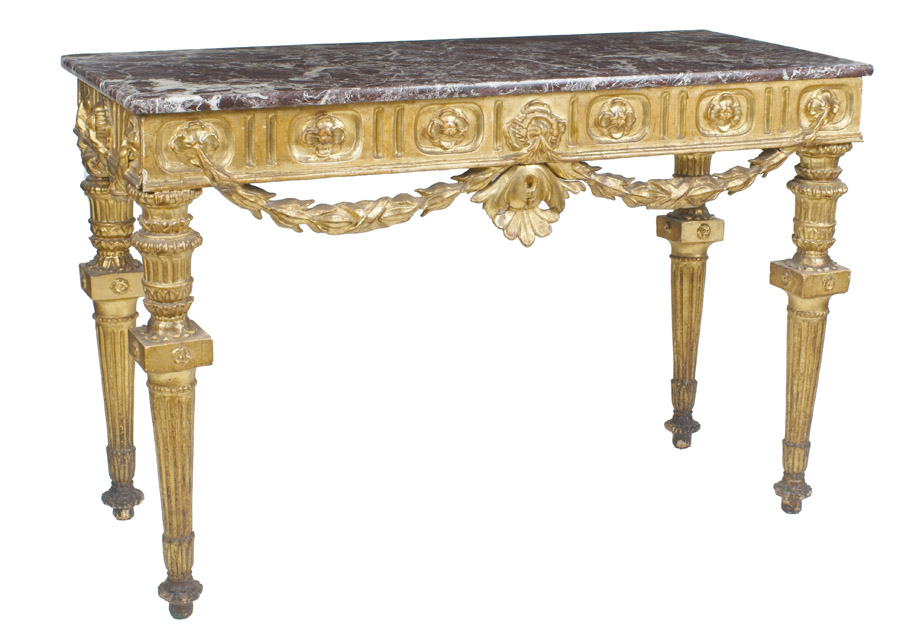 CONSOLE LUIGI XVI Francia, XVIII Sec. in legno intagliato e dorato, piano rettangolare in marmo rosso Francia, fascia decorata a motivi floreali e di ghirlande, gambe tornite e scanalate 92x141,5x60,5 cm.