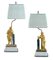COPPIA DI LAMPADE IN BRONZO Francia, XIX Sec. dorato e cesellato a raffigurare due personaggi in abiti neoclassici sorretti da colonne in marmo verde Alpi, basi in marmo bianco di Carrara poggiante su base in bronzo, complete di paralume h. 65 cm.