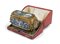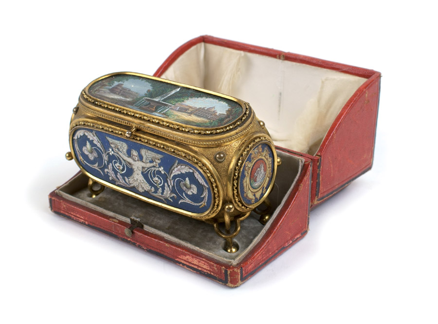 RARA SCATOLA PORTAGIOIE IN MICROMOSAICO E METALLO DORATO Roma, fine XIX Sec. Sul coperchio è inserito un micromosaico su cassina in metallo raffigurante " Roma profana e Roma sacra rappresentata dal Colosseo di notte e da Piazza San Pietro divisi dalla fontana del Pincio", ai lati sono inseriti quattro mosaici a fondo blu su cassine di metallo raffiguranti "Grottesche con maschere bacchiche e cigni entro cornici". Entro astuccio originale firmato Cesare Salandri Mosaicista Roma, Via del Babuino, 94. Bibliografia: Micromosaici Romani, Roberto Grieco, Gangemi Editore, Roma, pag.113 8x12,5x6 cm.