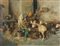 TITO PELLICCIOTTI Barisciano (L'Aquila) 1871 - 1950 "Interno di stalla con animali e personaggi", olio su tela, firmato in basso a destra Tito Pellicciotti si formo' presso l’Accademia di Belle Arti di Napoli sotto la guida di F. Palizzi. Da questi derivò l’attenzione per le figure di animali, che riprodusse sia nella calma della stalla sia liberi e al pascolo. Dipinse anche paesaggi (Paesaggio abruzzese, Milano, Galleria d’Arte Moderna), quadri di genere, teste di contadini, particolarmente intense, e dal 1920, dopo un soggiorno in Nordafrica, anche soggetti arabi. La sua pittura, agile e dotata di cromie brillanti, mostra evidenti debiti con quella di F. P. Michetti, del quale riprese gli aspetti più insoliti. 57x75 cm.