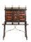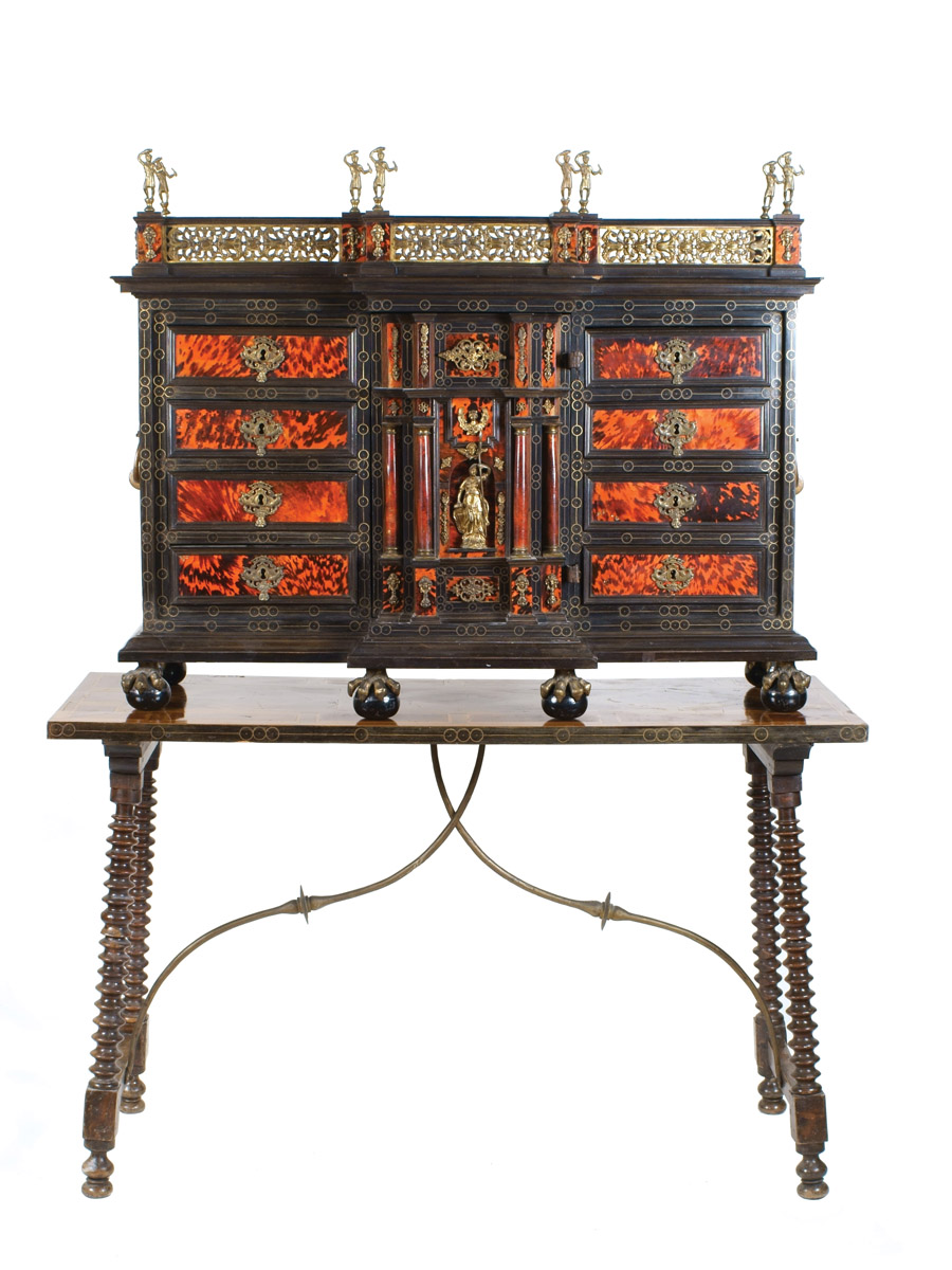STIPO MONETIERE IN LEGNO E TARTARUGA Italia, XVIII Sec. impreziosito da ricche applicazioni e sculture in bronzo, fronte a doppio tempietto delimitato da colonne con ai lati otto cassetti, fianchi lineari, base a consolle con piano intarsiato a motivi geometrici poggiante su gambi tornite riunite da due sostegni in ferro battuto, lievi difetti 174x138x49 cm.