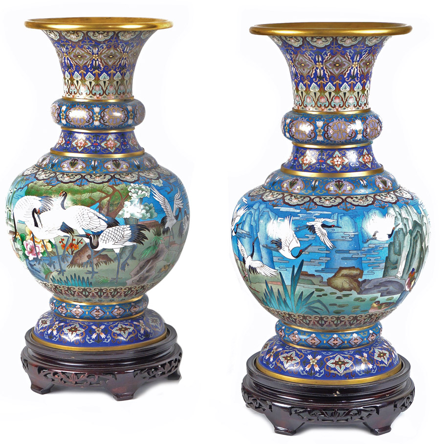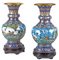 COPPIA DI VASI IN SMALTO CLOISONNE Giappone, XIX Sec. struttura in bronzo decorata a motivi vegetali e di animali, basi circolari in legno traforato h. 51 cm.