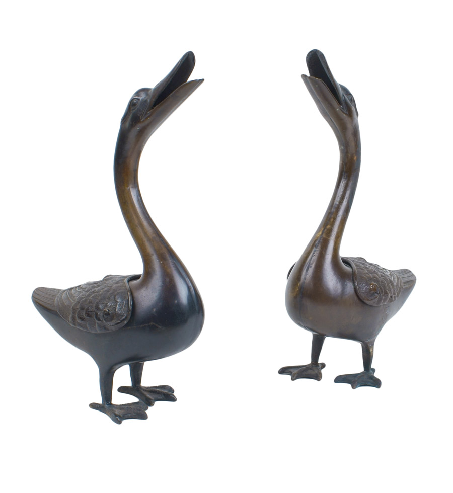 COPPIA DI BRUCIAPROFUMO IN BRONZO BRUNITO Cina, XX Sec. a foggia di oche 35x21x12 cm.
