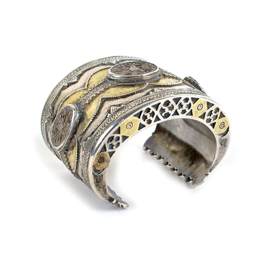 PARTICOLARE BRACCIALE SCHIAVA IN ARGENTO Marocco, XX Sec. sbalzato ed inciso e parzialmente dorato Peso lordo 225 gr.
