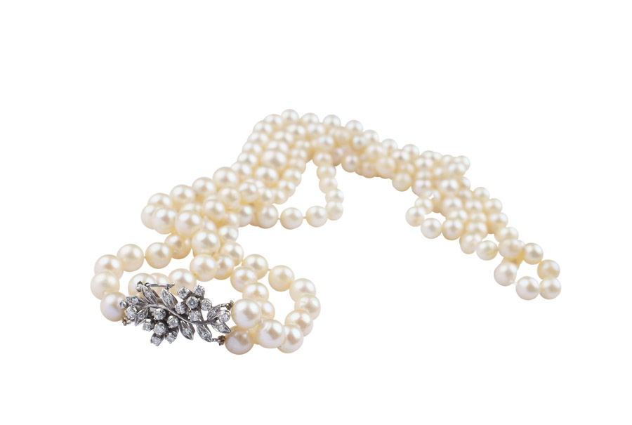 COLLANA A DUE FILI DI PERLE COLTIVATE anni 50/60 disposte a gradazione da mm. 12,5 a mm. 10 con chiusura laterale a motivo floreale in oro bianco 18kt con diamanti taglio brillante per 0,35 punti circa, lunghezza cm. 54 peso 85 gr.