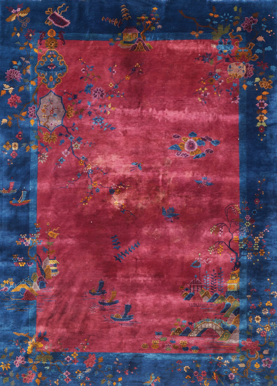TAPPETO CINA pimi del 900 decorazione con elementi naturalistici e floreali su fondo color prugna, bordura blu cobalto, difetti 415x311 cm.
