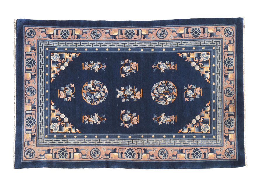 TAPPETO PECHINO Cina, XX Sec. decorato a motivi di bouquet di fiori su fondo blu 180x120 cm.
