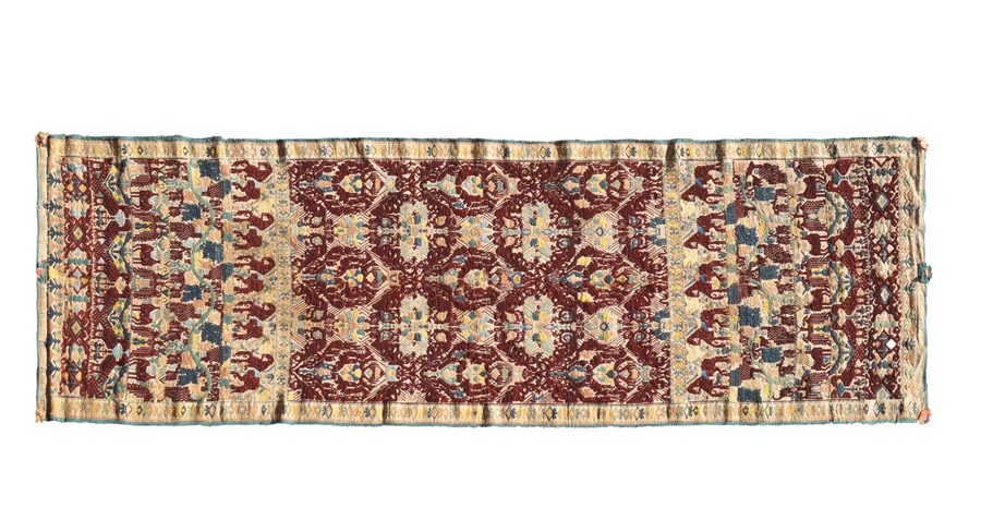 PARTICOLARE ARAZZO SARDO XX Sec. tessuto a motivi floreali e di animali, lievi difetti 264x84 cm.
