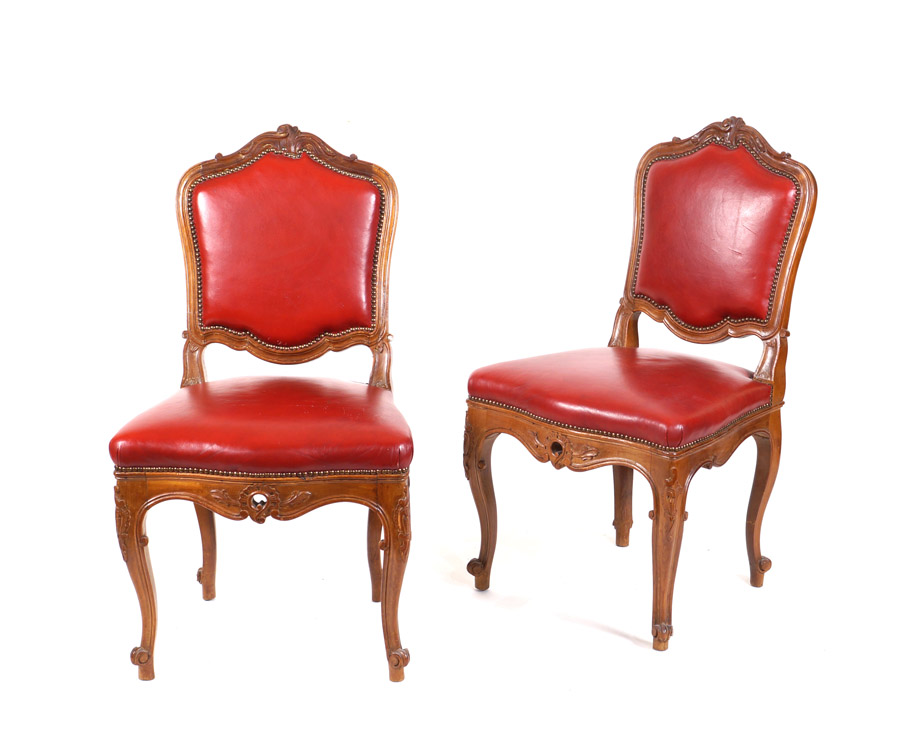 QUATTRO SEDIE IN NOCE Francia, XX Sec. intagliato a motivi floreali, seduta e schienale rivestiti in ecopelle h. 96 cm.
