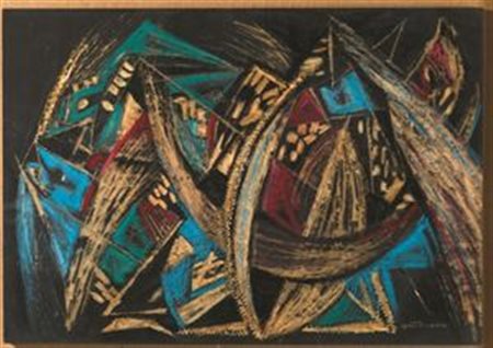 MASTROIANNI UMBERTO Fontana Liri 1910-1998 Marino Composizione 1959 Tecnica mista su tavola 70x100 cm Firma in basso a destra Già Galleria La Bussola, Torino, etichetta al retro Mixed media on wood Signed lower right