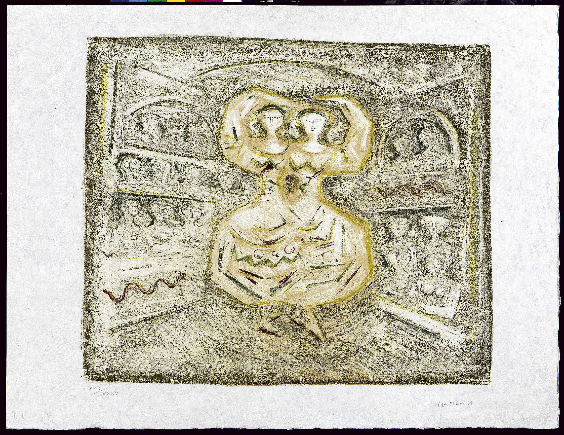 Massimo Campigli Berlin / Berlino 1895 – Saint – Tropez 1971 Danzatrici, 1965 Stampa Multiplo Litografia a colori / BFK Rives board, 41 x 48,5 cm Firmato datato in basso a destra: “Campigli 65” Edizione n. 31 / 35 Tänzerinnen, 1965 Farblithographie / BFK Rives board, 41 x 48,5 cm Unten rechts signiert: „Campigli 65“ Auflage Nr. 31 / 35