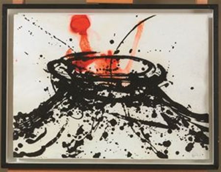 ZORIO GILBERTO Andorno Micca 1944 Vulcano 1986 Tungsteno e sabbia di Stromboli su carta con intervento di acquarello, 44x60 cm Firma in basso a destra Autentica dell'artista su fotografia Tungsten Stromboli and sand on paper with watercolor intervention Signed lower right