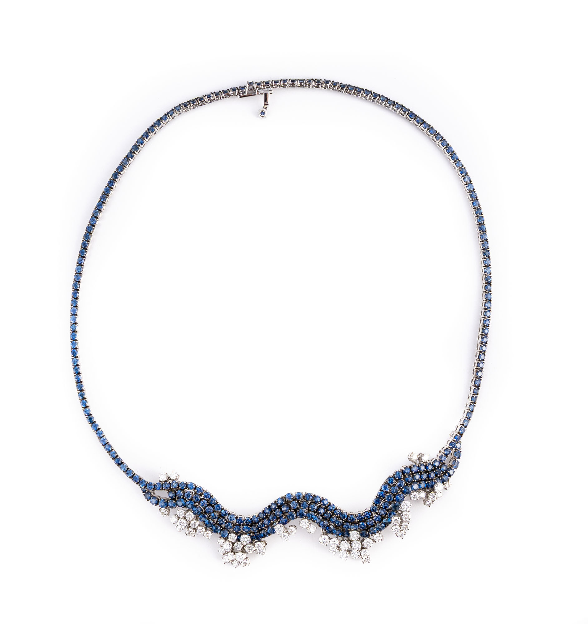 Damiani, collana in oro, diamanti e zaffiri, collezione Flutti, anni 2000Collana girocollo semirigida in oro bianco 18kt impreziosita da zaffiri taglio rotondo per ct 17.00 ca e diamanti taglio brillante per ct 4.05 ca.Firmata DamianiGr 42 Lunghezza 42 cm ca