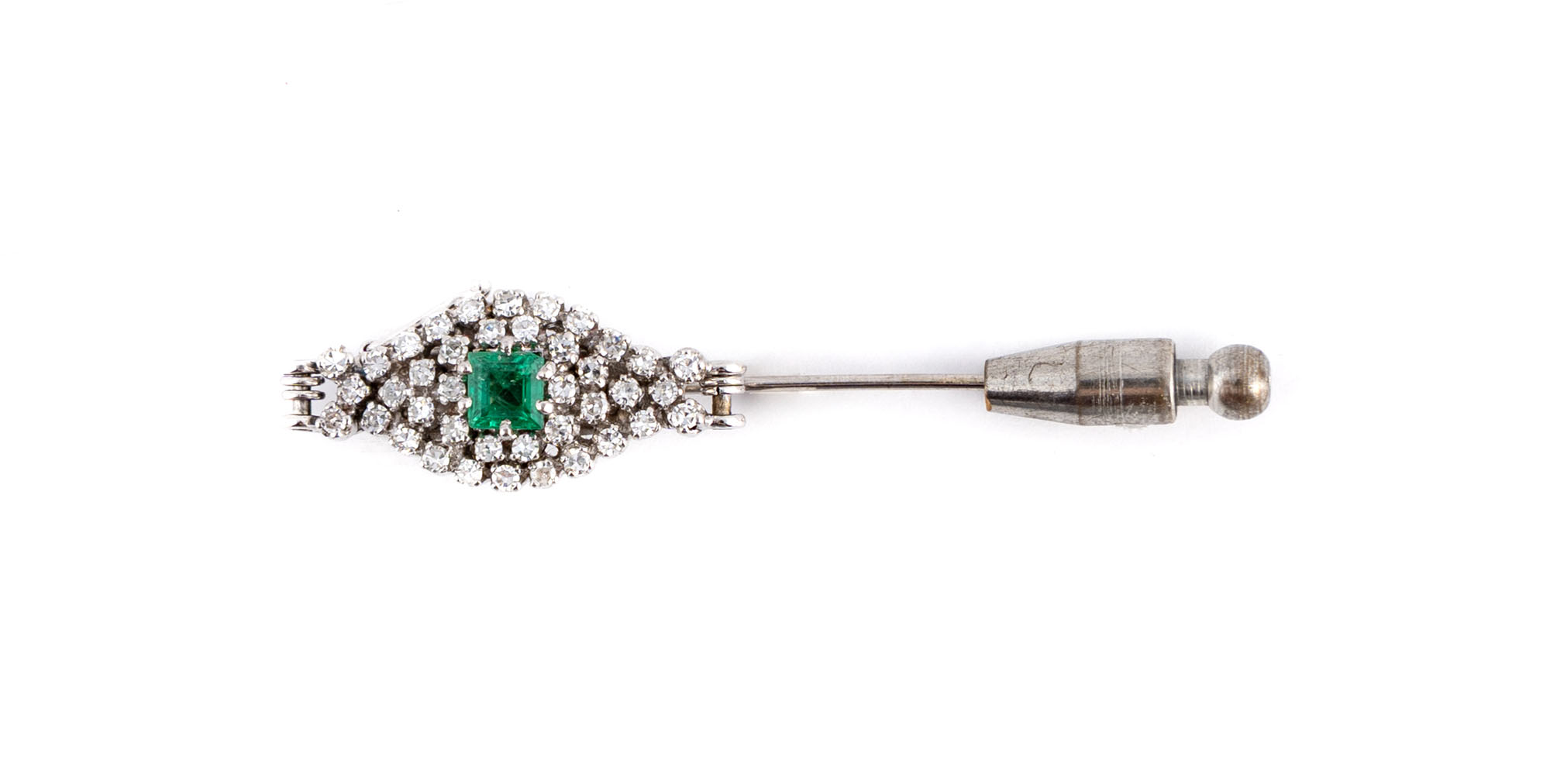 Spilla in oro bianco con smeraldo e diamantiSpilla in oro bianco 18kt di forma geometrica con al centro uno smeraldo taglio rettangolare di 0.24 ct, contornato da diamanti taglio huit huit per ct 0.60 caChiusura in metallo biancoGr 5.1Dimensioni 2.3 x 1.1 cm