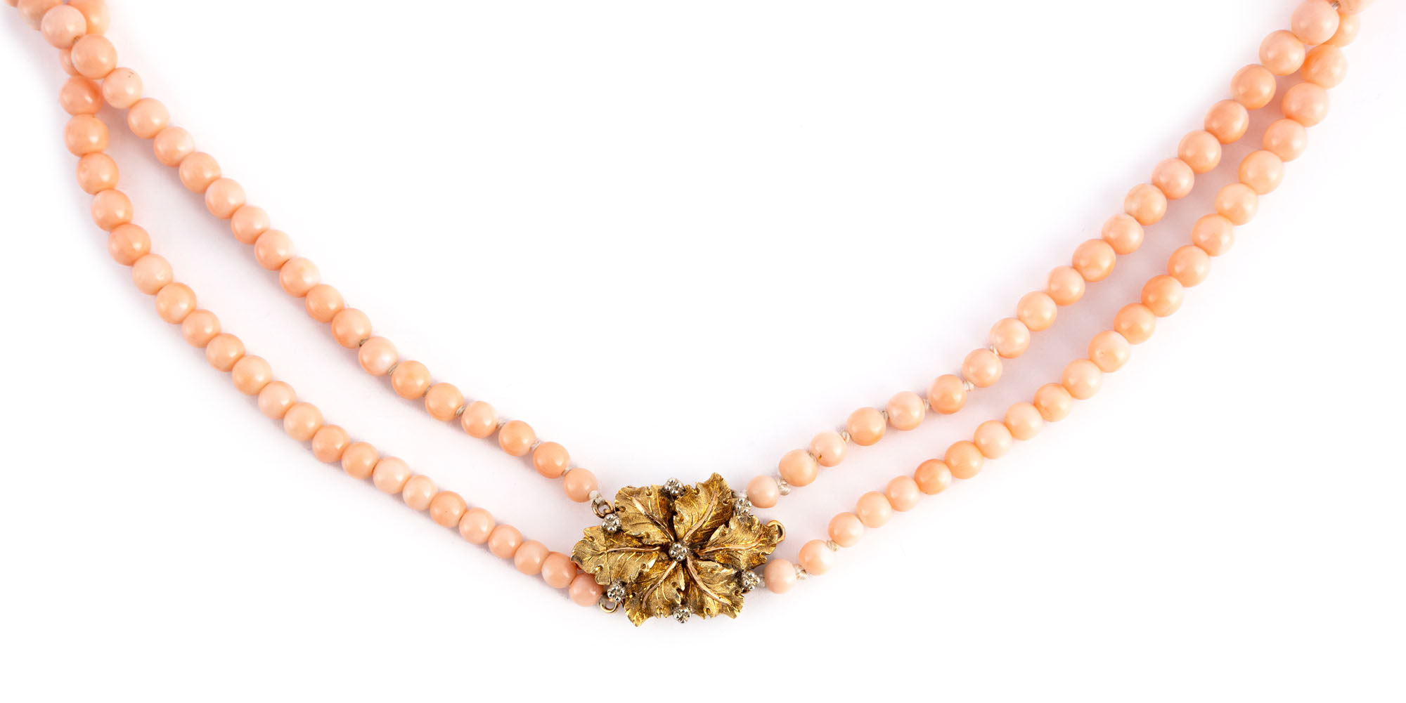 Buccellati, collana a due fili in corallo peau d'ange, 1970 caCollana a due fili di sfere in corallo peau d'ange disposte a gradazione da 4 mm a 12 mm. Chiusura in oro giallo satinato 18kt a guisa di foglie di vite impreziosite da piccoli elementi puntiformiFirmata Buccellati 69, ItalyGr 65Lunghezza 51 cm ca
