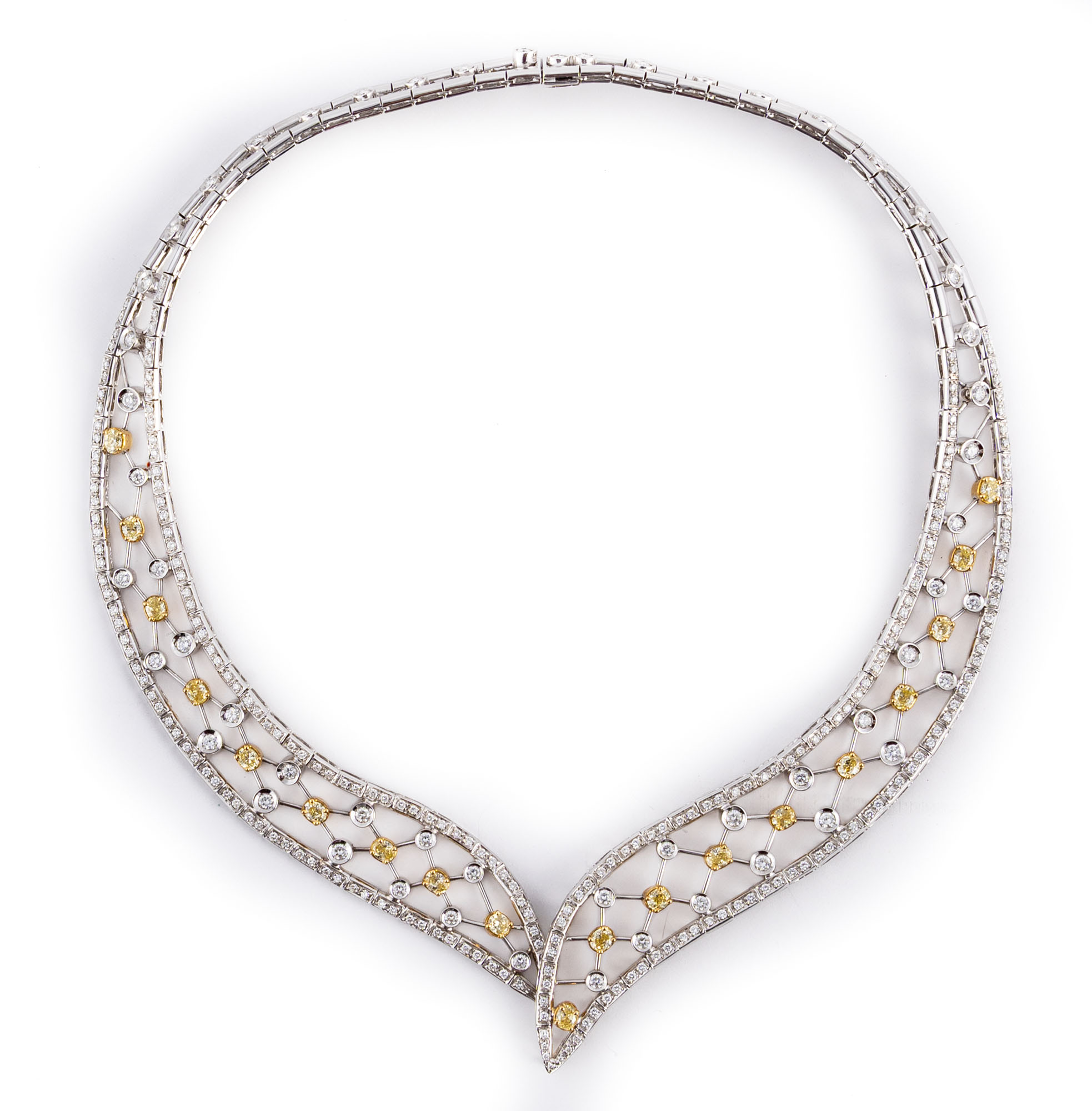 Damiani, collana in oro e diamanti, collezione Rete, anni 2000Collana girocollo semirigida in oro bianco 18kt, composta da due maglie intricate impreziosite da diamanti bianchi e fancy yellow taglio brillante di ct 6.32 caFirmata DamianiGr. 59.7Lunghezza 45 cm ca