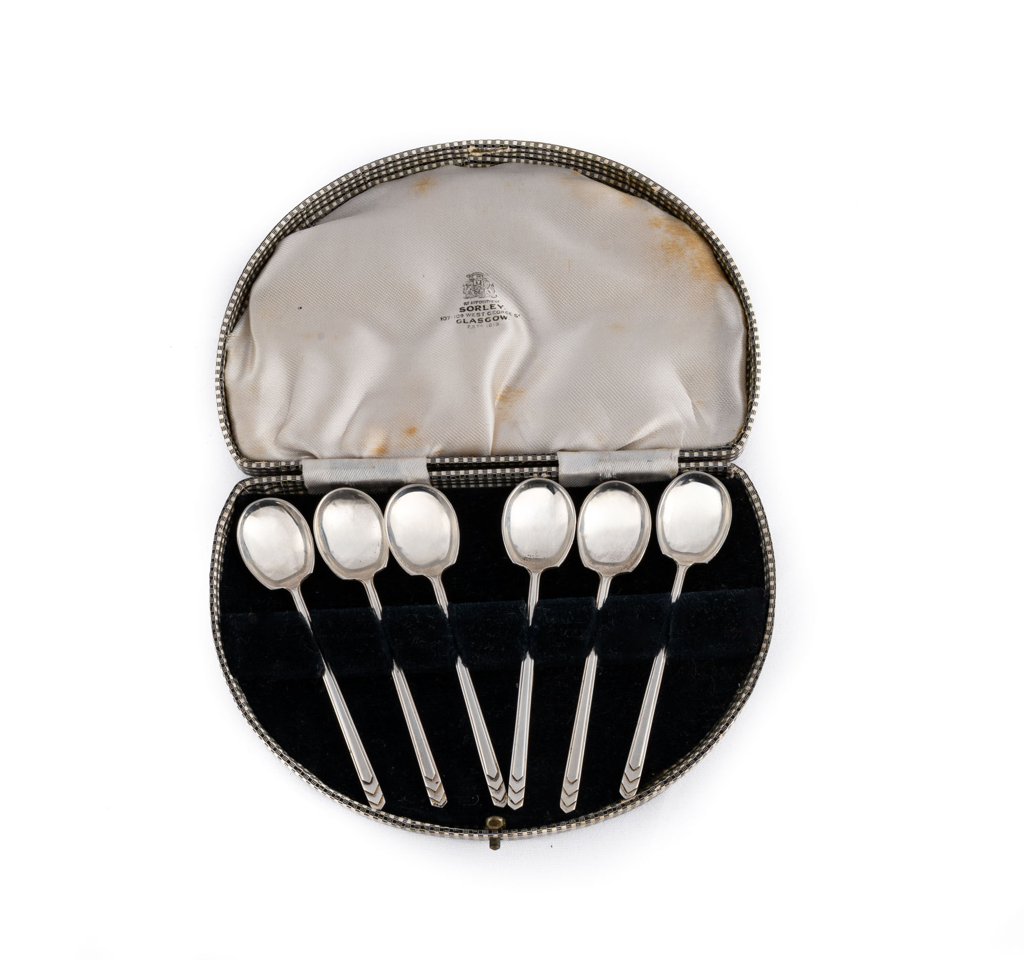 Sei cucchiaini da caffè in argento 925, Inghilterra, XX secoloCon tre linee a sbalzo sulla sommità. Punzoni dell'argentiere, James Dixon & Son, entro custodia, 1930 caGr 35.5Dimensioni 8.6 cm
